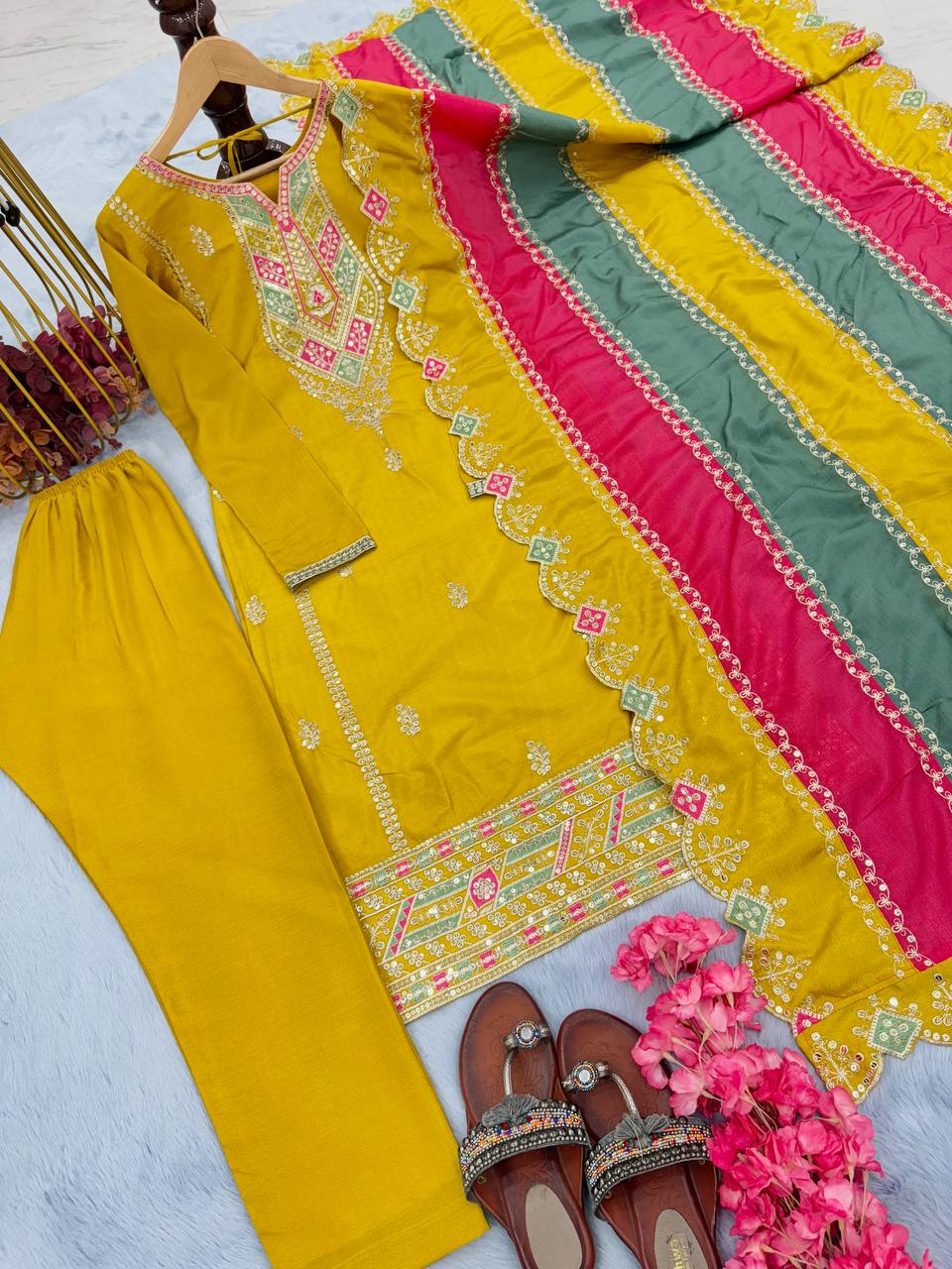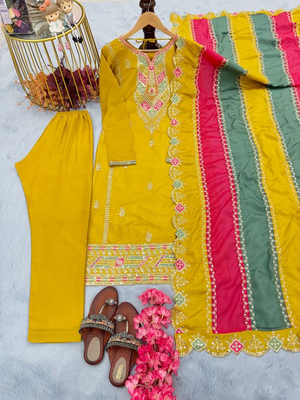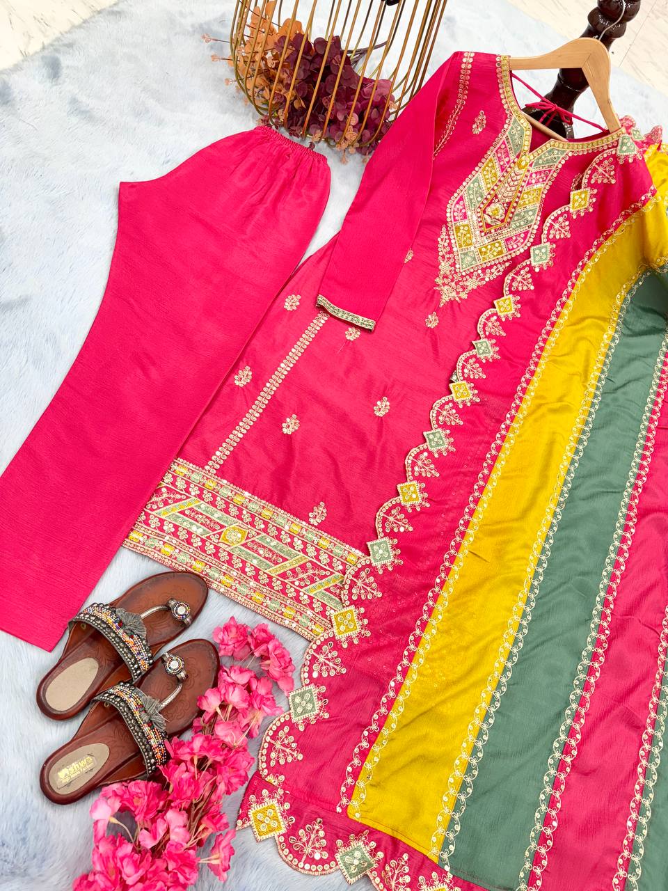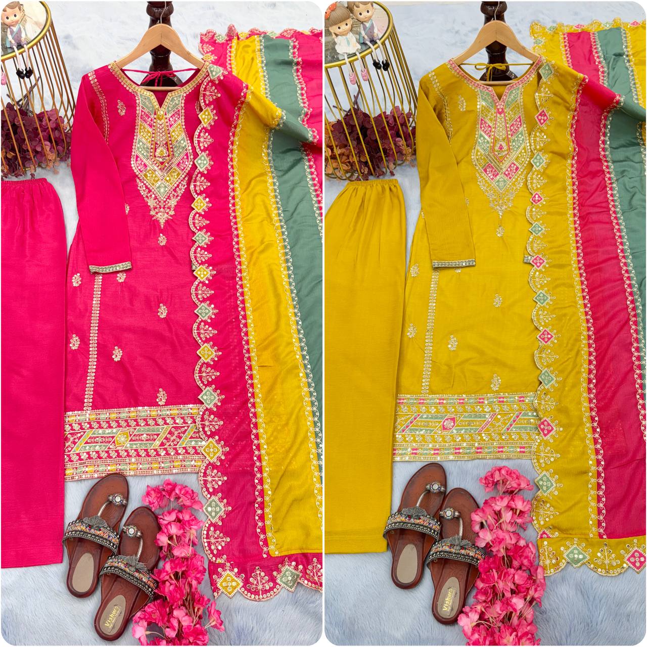 Premium Designer Party Wear: Pure Chinon Silk Top, Palazzo & Multi-Color Dupatta Set