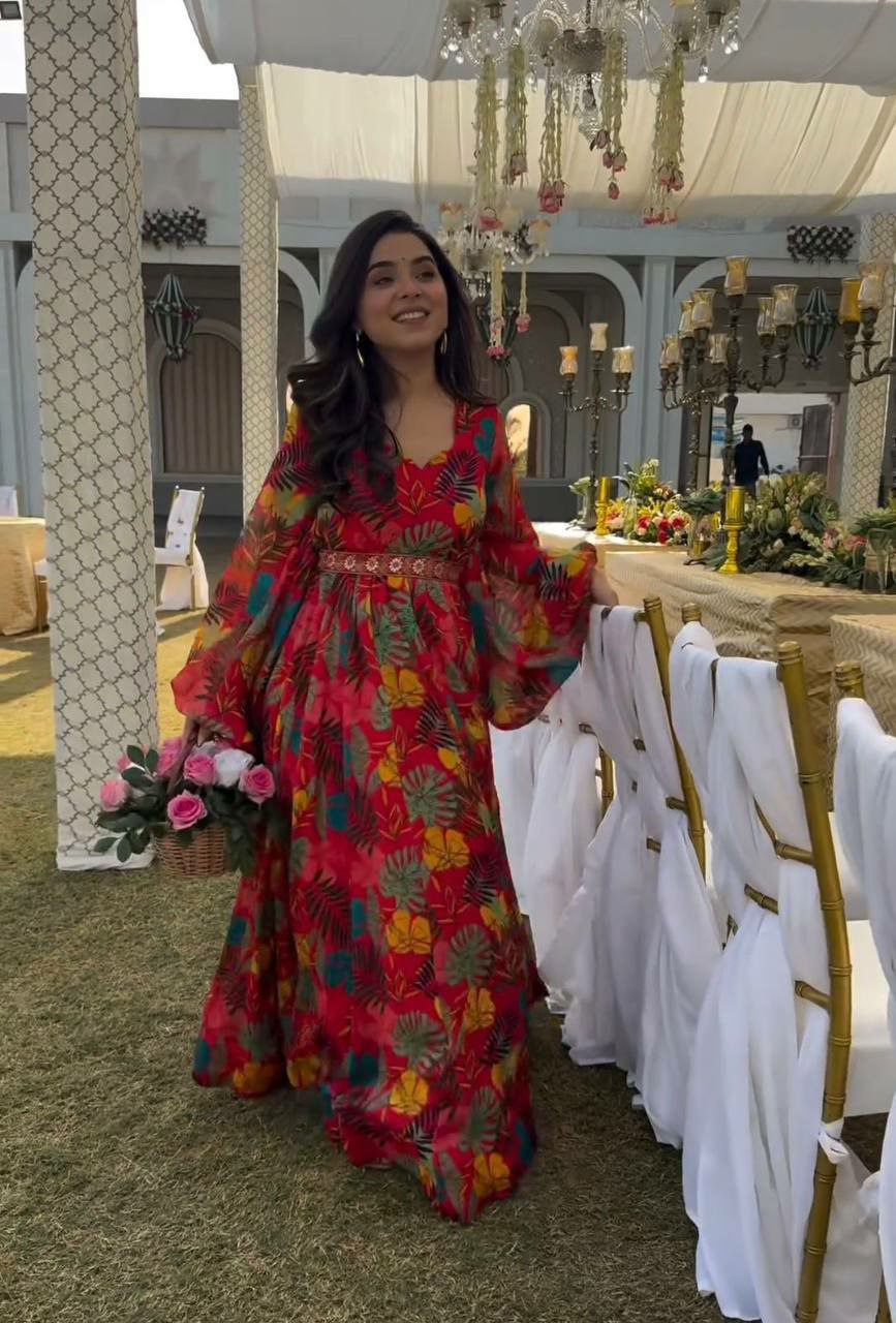 Featuring Georgette Maxi Dress With Finely Curated Embroidery Belt In flower Shade This Is A Complete Vibe At All Those Festival And Parties For The People Who Are Always Up For Fashion Game With Subtle Detailing! Hurry, Get Yours Now! With Beautiful Sleeves And A Beautiful Back With Latkan's And Square Neckline