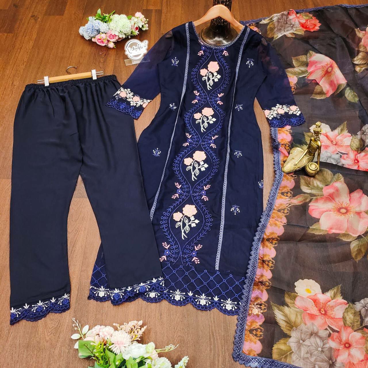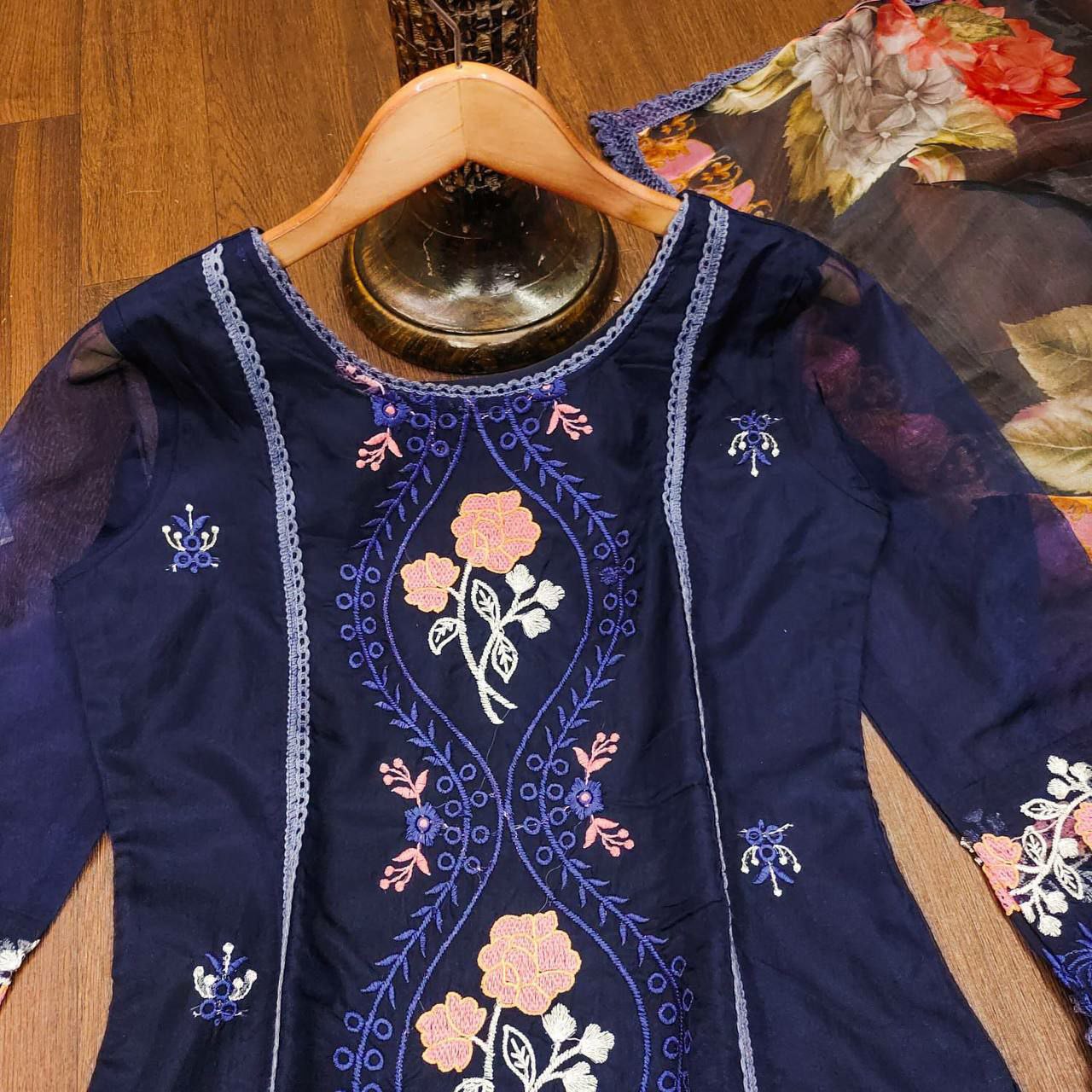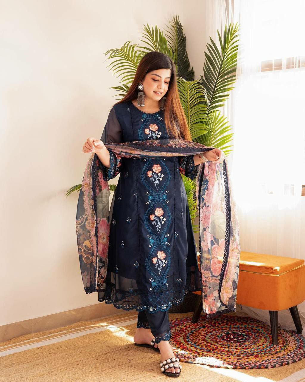 embroidery Suit set. Crafted with delicacy, the kurta has beautiful embroidery all-over. The embroidered sleeves and bottom adding an extra touch of elegance, making it ideal for any festive celebration. It is paired with matching pants and dupatta. It comes with lining