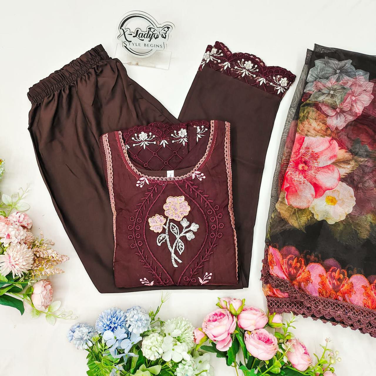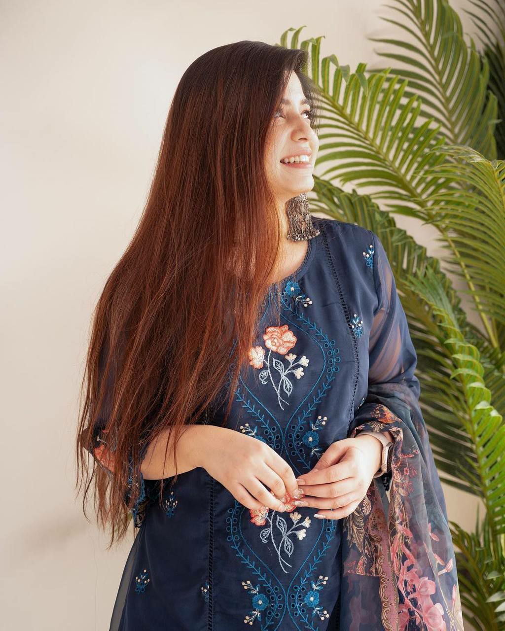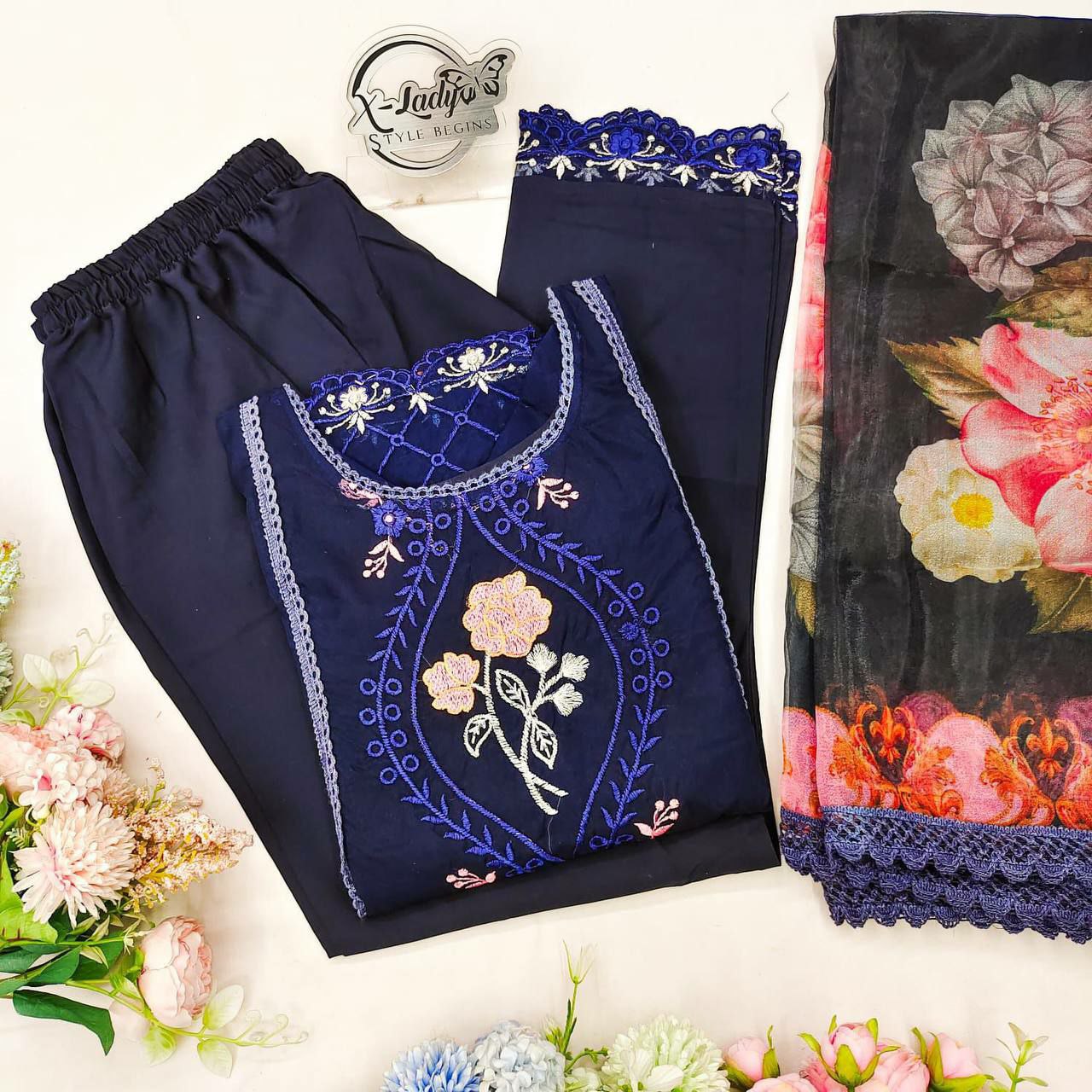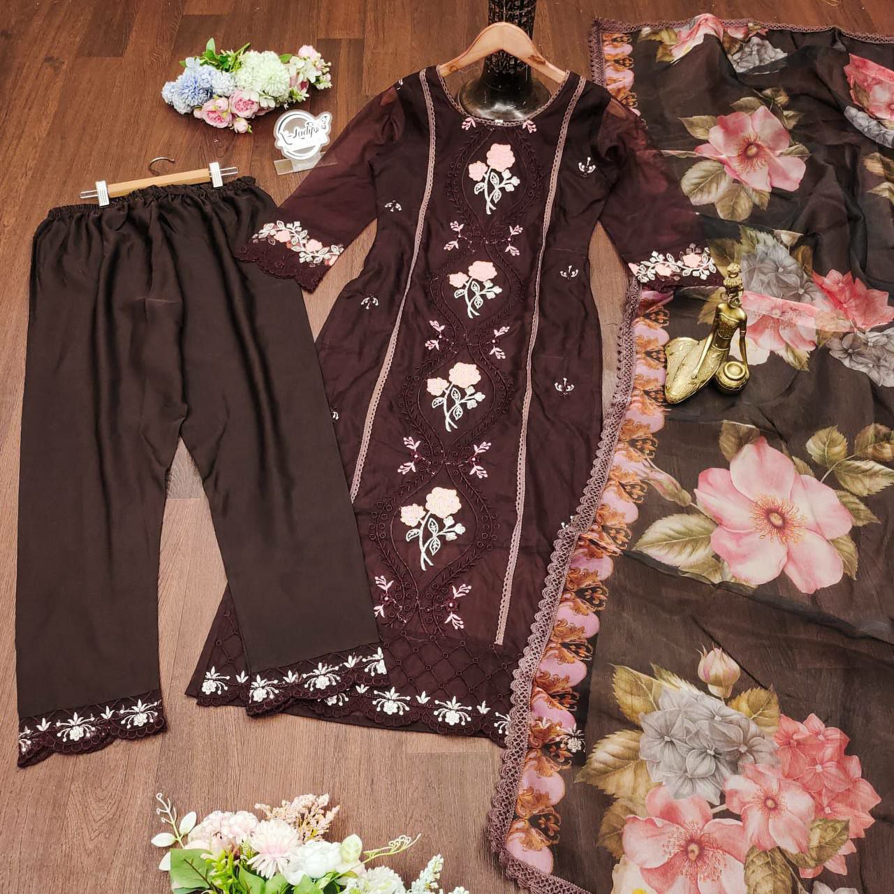 embroidery Suit set. Crafted with delicacy, the kurta has beautiful embroidery all-over. The embroidered sleeves and bottom adding an extra touch of elegance, making it ideal for any festive celebration. It is paired with matching pants and dupatta. It comes with lining