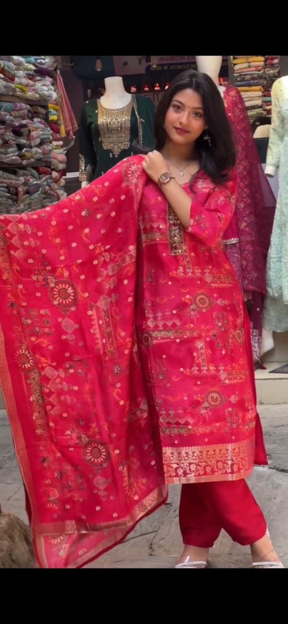 Flaunt the amazing Red color of this suit in your upcoming festivities. The divine and luxurious fabric with weaving zari gives it elegant look. It is decorated with cutdaana hand work and premium mirror works
