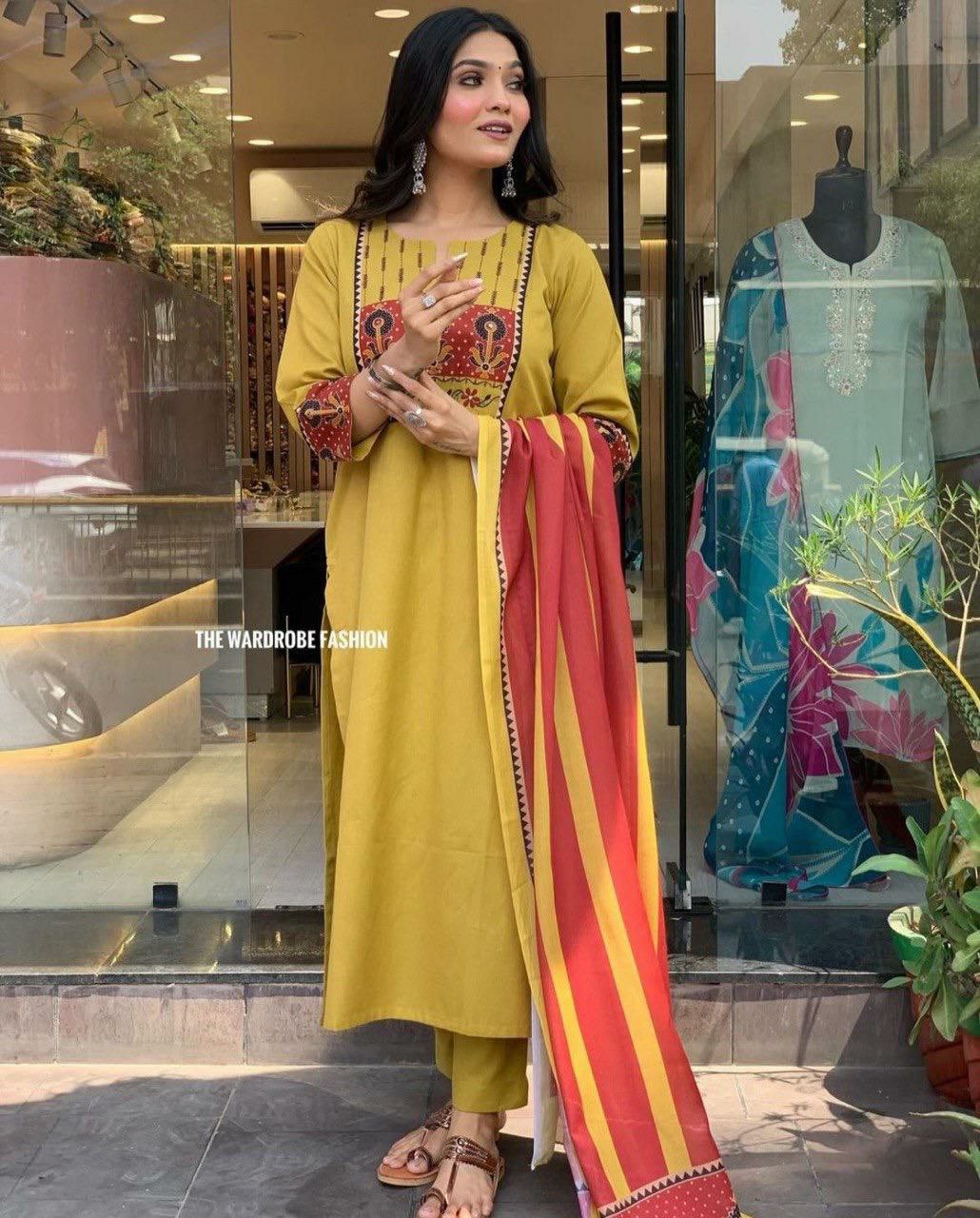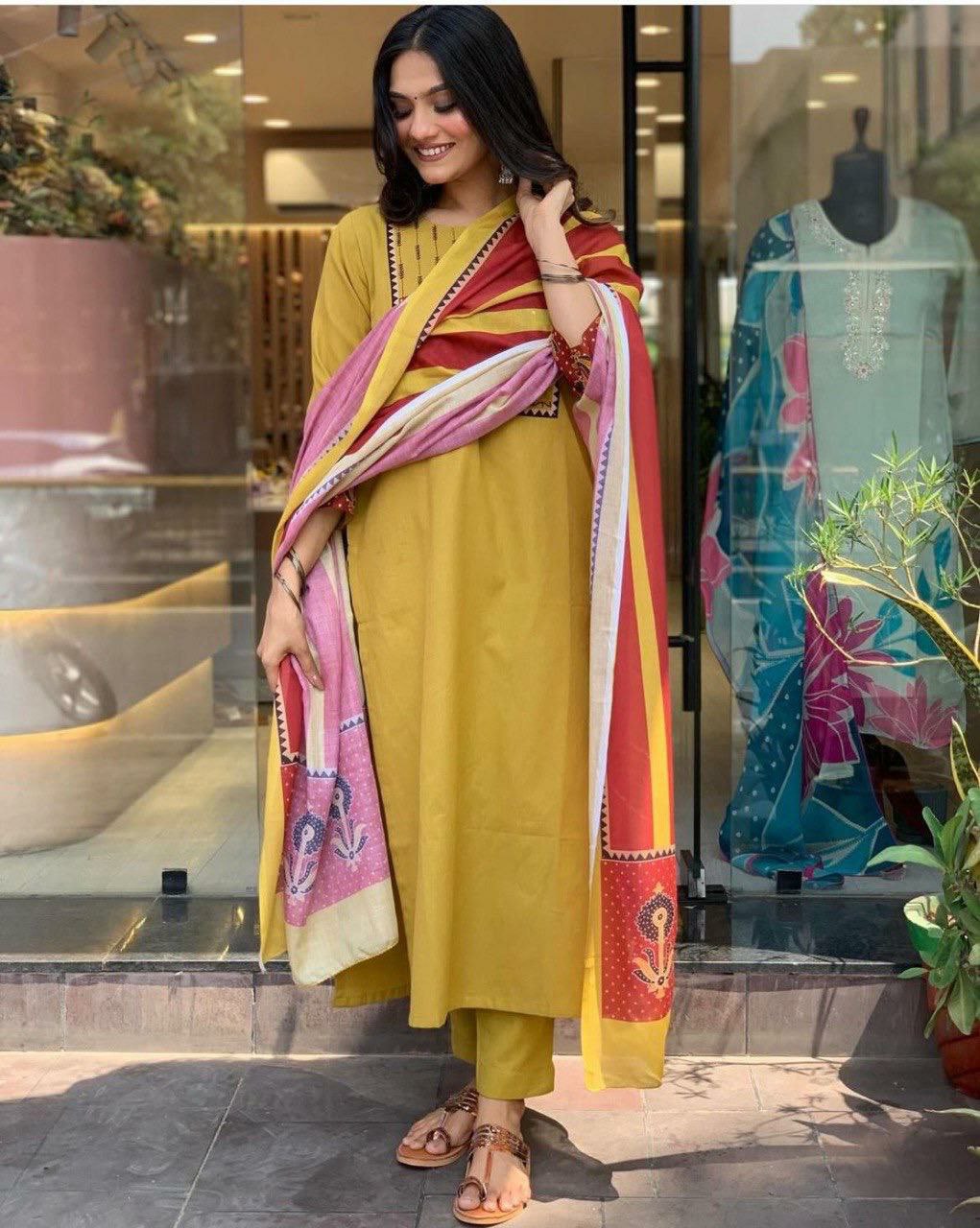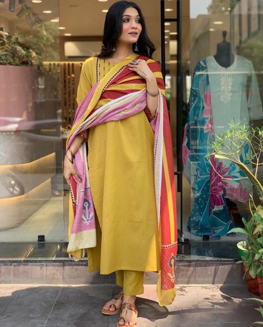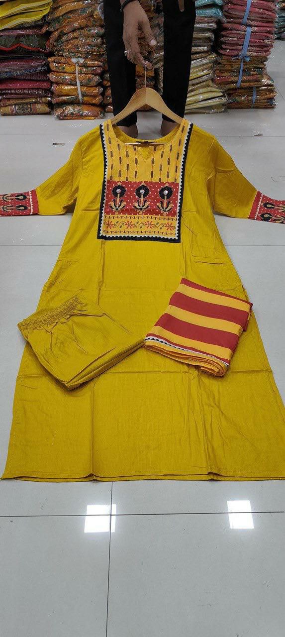 Kurti Suit Set seems to be a party wear outfit made from Rayon fabric with Maslin Duptta.(3-Pair)